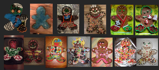 The kids jumbo gingerbread cookies -- even as teens they humor their Auntie. We have one that touched the sun, and has some of the galaxy on it -- including Saturn and the Milky Way. Then, we have the ginger that had a wounded leg (Auntie pan transfer issue), with it getting taken to extreme with additional decorated injuries, and a cane for support...not a candy one.